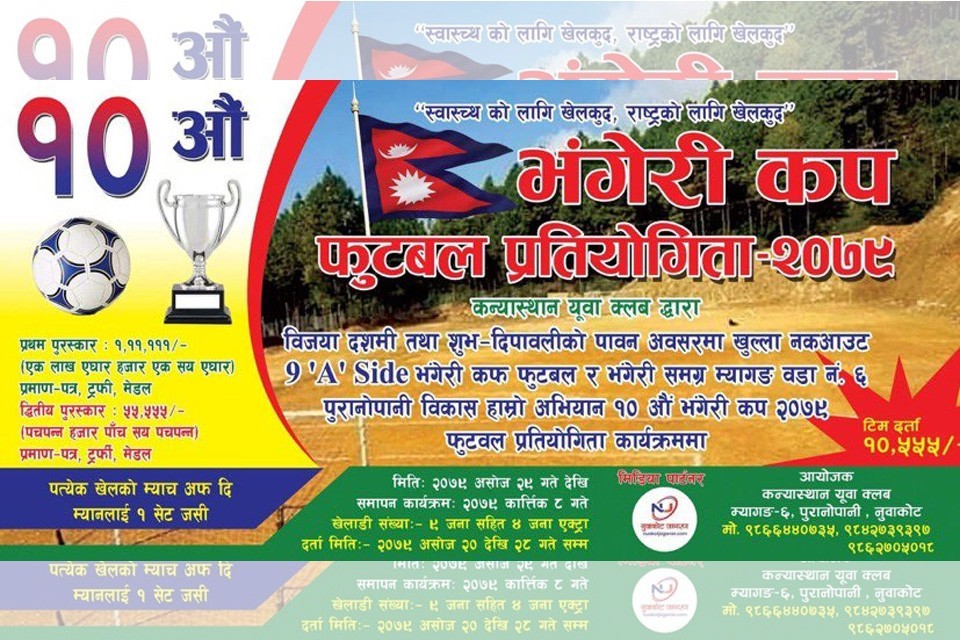 The 10th Bhangeri Cup Nine A Side Football Tournament will be held on the occasion of Bijayadashami and Diwali from next Ashoj 29th organized by Kanyasthan Youth Club, Myagong-6, Puranopani, Nuwakot.