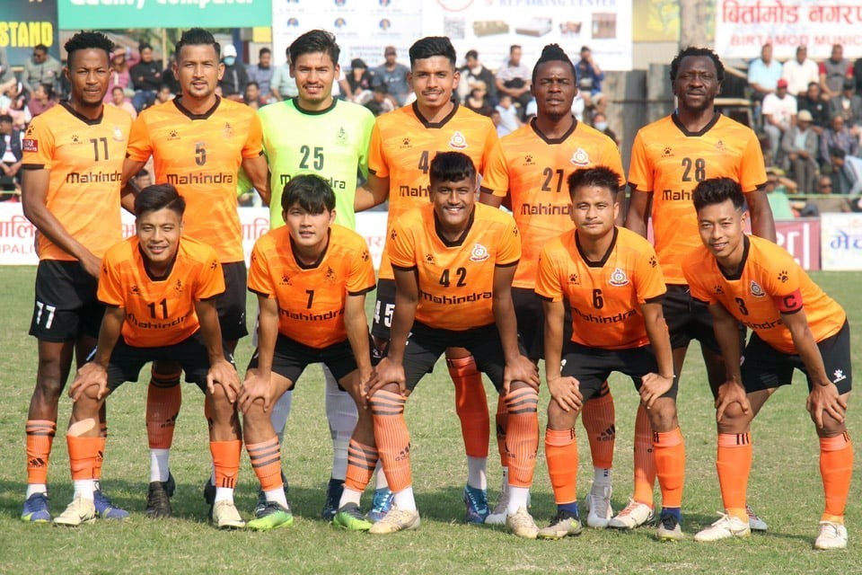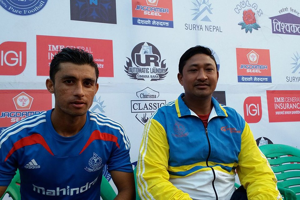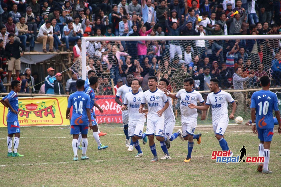 Sonam Bhutia of Machhindra and Awas Lamichhane of APF gets red carded with two yellows.